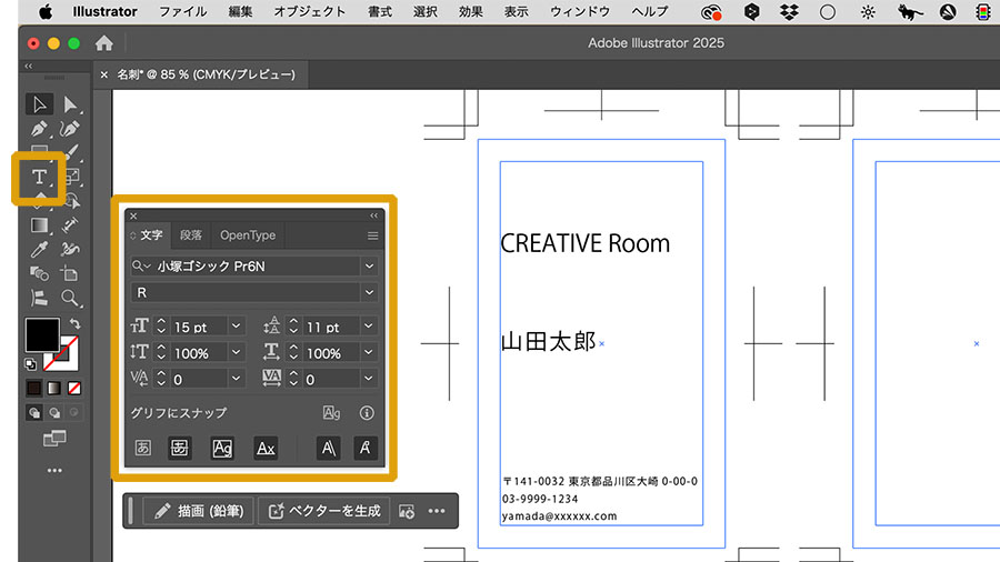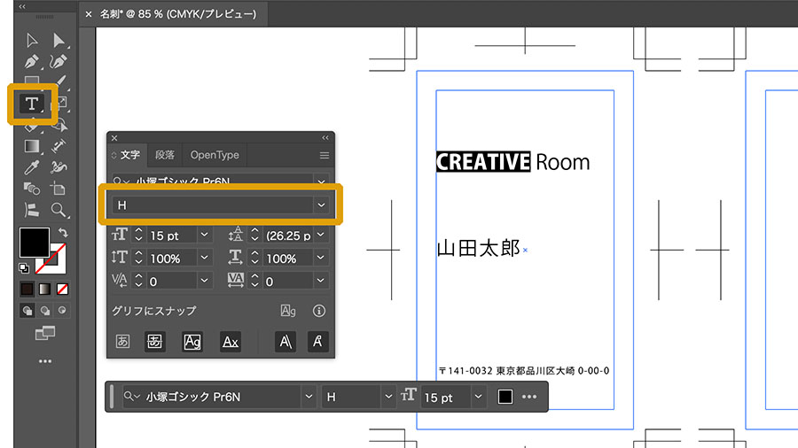 名刺に入れるブランド名やサークル名を入力し、文字スタイルを調整してオリジナルロゴを作ります。 文字 ツールを選び、図の位置でクリックして「CREATIVE Room」と入力します。 文字 パネルでフォントサイズを「15pt」に設定します。