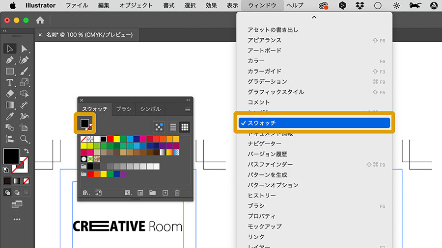 ロゴや文字に色をつけます。メニューから ウィンドウ/スウォッチ を選択し、 スウォッチ パネルを表示します。「 塗り 」をクリックして前面に表示し、 選択 ツールでロゴを選びます。