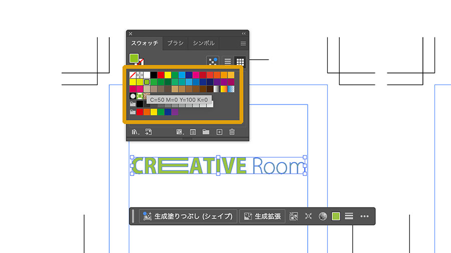 スウォッチ パネルの上段にある緑色にカーソルを合わせクリックします。CMYK値は「C=50 M=0 Y=100 K=0」と表示されます。これでロゴの塗りが緑色に変わります。