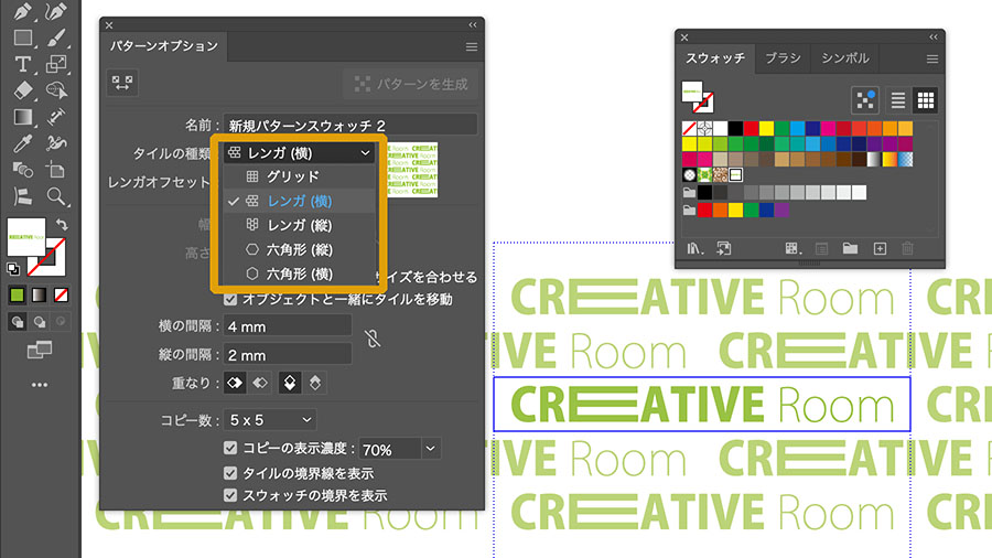 登録したパターンスウォッチをダブルクリックし、パターンを編集モードで開きます。 パターンオプション パネルの「 タイルの種類 」を「レンガ(横)」に変更します。