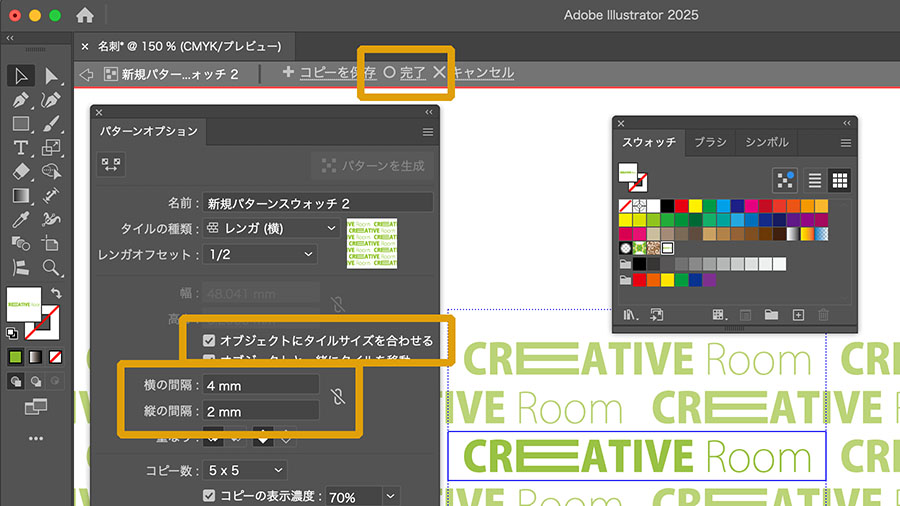 「オブジェクトにタイルサイズを合わせる」にチェックを入れます。「横の間隔」を「4mm」、「縦の間隔」を「2mm」に設定し、「 ○完了 」をクリックして終了します。