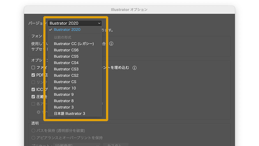 その場合は、保存時に表示される Illustratorオプション ダイアログボックスで「バージョン」を選び、指定されたバージョンに合わせて保存します。入稿前にあらかじめ印刷所にIllustratorの対応バージョンを確認しておくと安心です。