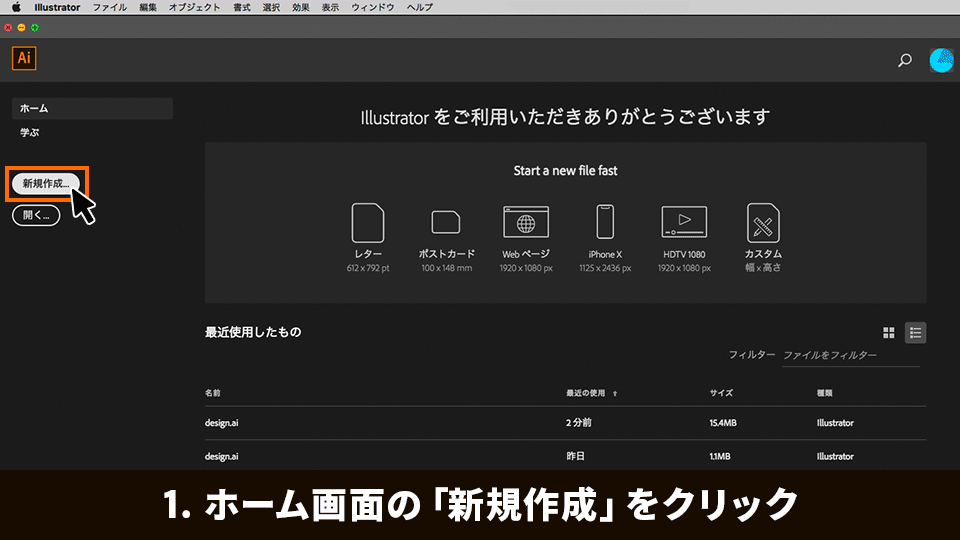 ・ Illustratorを起動し、ホーム画面の「新規作成」をクリックします