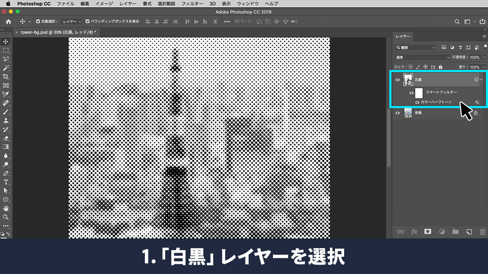 ・レイヤーパネルで「白黒」レイヤーを選択し、透明度を「30」%に変更します
