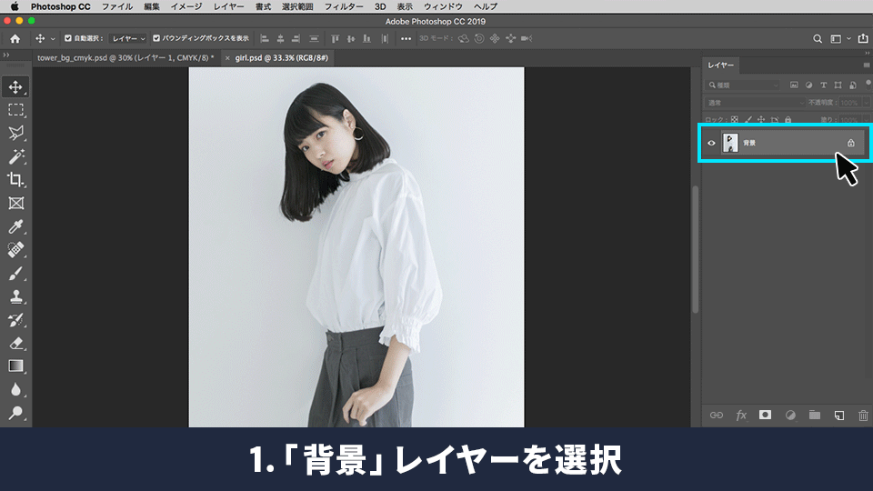 ・ レイヤーパネルで、「背景」レイヤーをパネル下部の「新規レイヤーを作成」アイコンにドラッグ&ドロップします