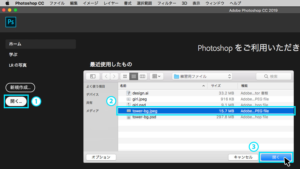 ・ Photoshopを起動し、ホーム画面の「開く」をクリックします