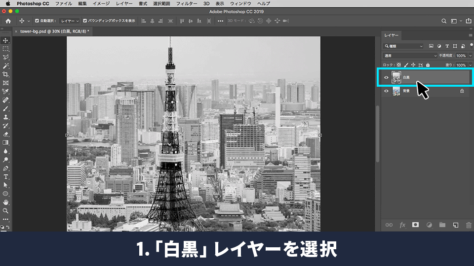 ・「背景のコピー」レイヤーの名前をダブルクリックして「白黒」に変更します