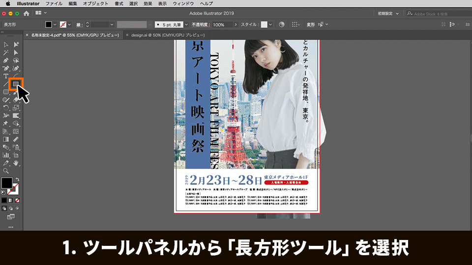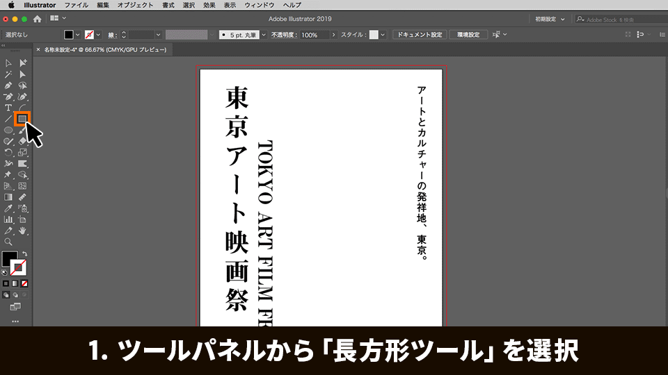 ・ ツールパネルから「長方形ツール」を選択し、日本語タイトルを囲むようにドラッグします