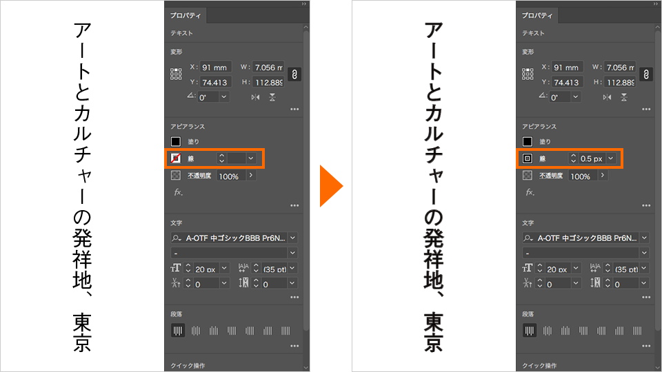 タイトルと同様の操作でキャッチコピー「アートとカルチャーの発祥地、東京」を作成します。文字は通常「塗り」だけが適用されていますが、これに「線」を追加することで、文字を太くすることができます。