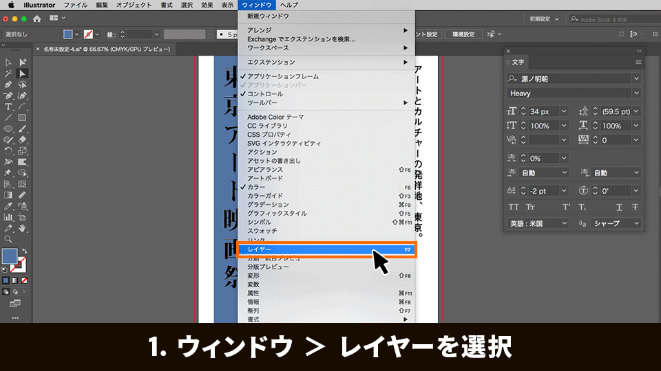 ・ タイトルテキストを選択した状態で、ウィンドウ > 書式 > 文字を選択して「文字」パネルを表示します