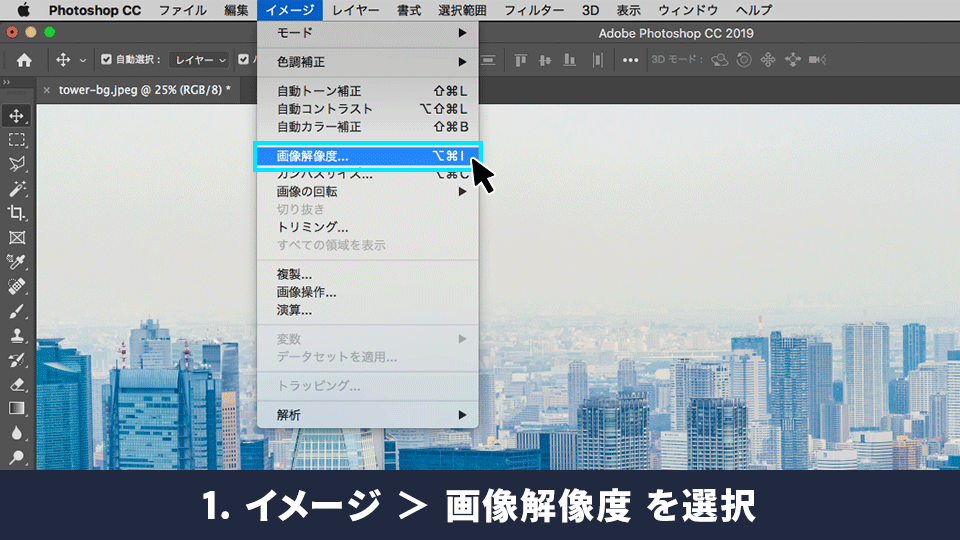 ・ イメージ > 画像解像度 を選択し、「画像解像度」ウィンドウを開きます