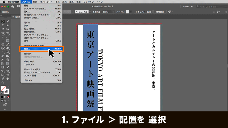・ Illustratorに戻り、ファイル > 配置 を選択します