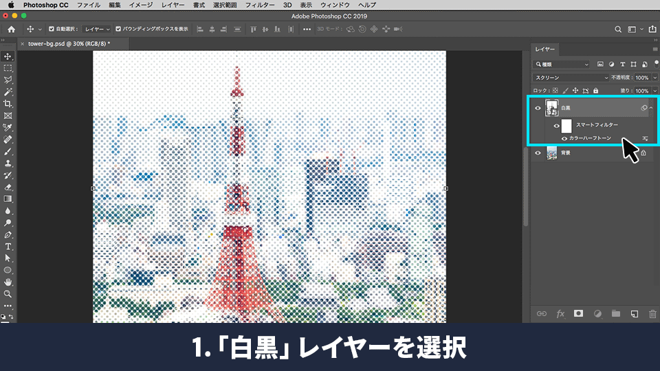 ・ 「白黒」レイヤーを選択した状態で、フィルター > ピクセレート > カラーハーフトーン を選択します