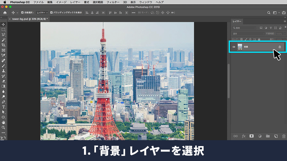 ・ 練習用サンプルファイルの「tower-bg. jpg」を選択し、「開く」をクリックします
