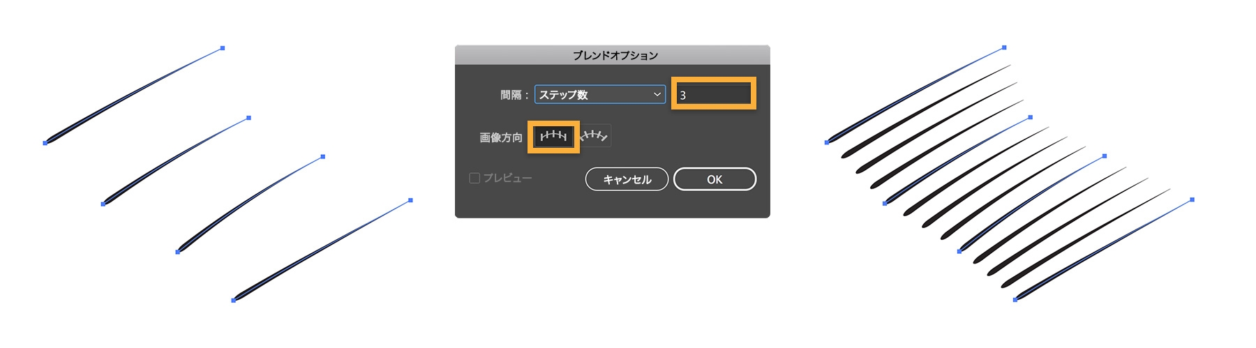 彼女の作品は主にクロスハッチングで仕上げられます。このテクニックを用いることで、繊細な陰影を作り出せます。クロスハッチングを作成するには、カスタムブラシで数本の線を描き、ブレンドツール(オブジェクト/ブレンド/ブレンドオプションに続いて、オブジェクト/ブレンド/作成を選択)を使用して平行な線を1セット作成します。さらに、再びブレンドツールを使用して別の角度でもう1セット作成し、2セットを重ねてクロスハッチパターンを作成します。