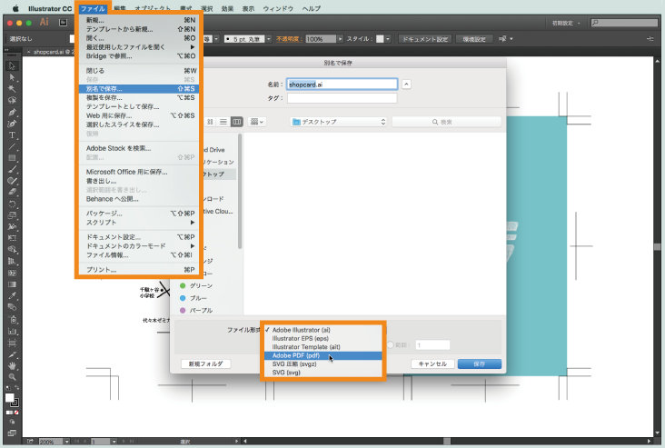 アプリケーションメニューの「 ファイル/保存 」を選択しそのままファイルを保存します。今回は入稿するためのデータ作成なので、PDF形式で別名保存します。同じくアプリケーションメニューの「 ファイル/別名で保存 」を選択し、ファイルの名前と保存する場所を決め、ファイル形式から「 Adobe PDF(.pdf) 」を選択して保存をします。