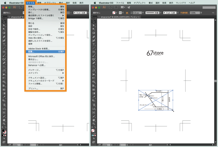 ロゴの配置と同じように、アプリケーションメニューの「 ファイル/配置 」からmap.pngを選択して地図を配置し、大きさと位置を決めます。