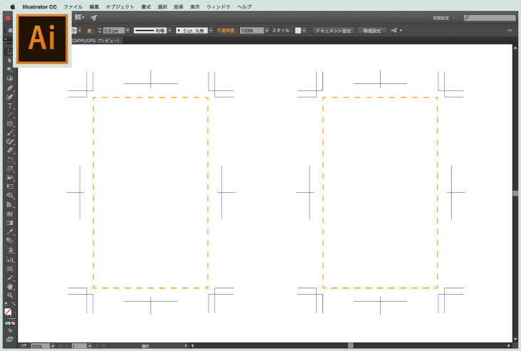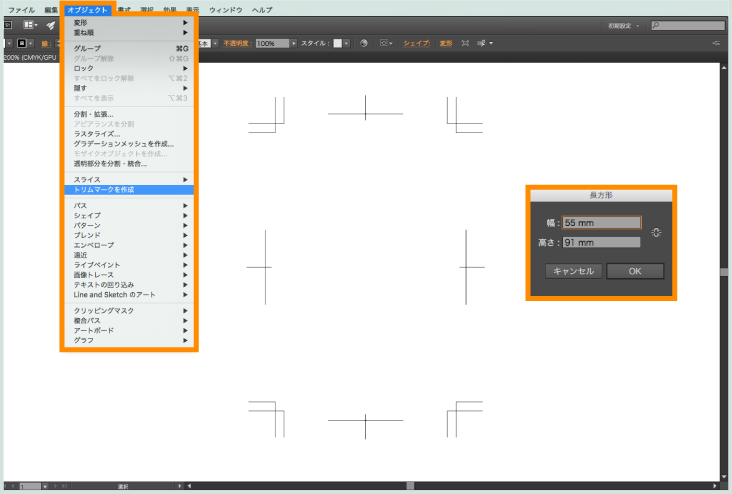 ツールバーから「 長方形ツール 」を選択し、アートボード上でクリックします。ダイアログがでてくるのでつくりたいもののサイズを入力して長方形をつくります。つくった長方形を選択した状態で、アプリケーションメニューの「 オブジェクト / トリムマークを作成 」を選択するとトンボが作成されます。