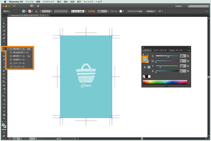 ツールバーから「 長方形ツール 」を選択します。トンボの左上から右下までドラッグし、トンボいっぱいに長方形をつくります。長方形の色を変更したい場合は、長方形をクリックして選択し、カラーパネルの塗りを前面に出した状態で色を選択します。