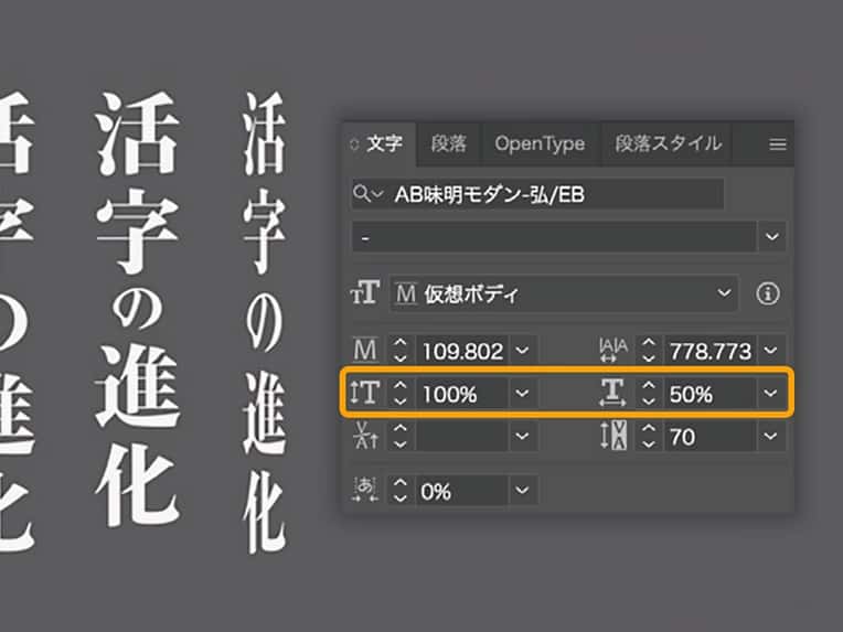 新規ドキュメントを作成し、「文字(縦)ツール」で「活字の進化」と入力します。