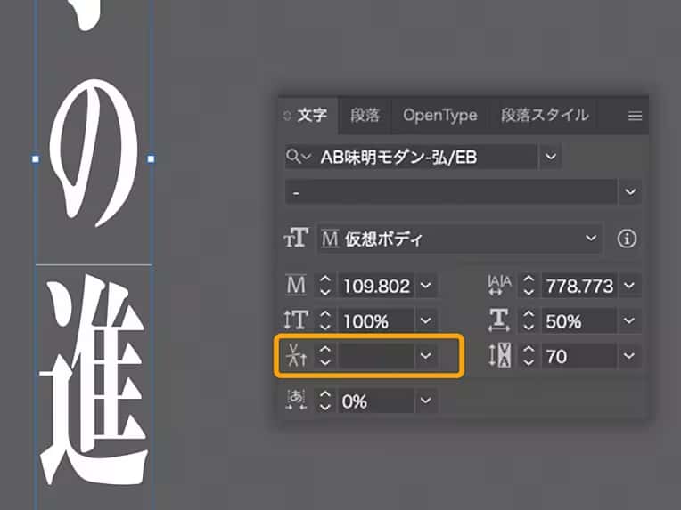 空きすぎている文字と文字の間にカーソルを当て、「option+矢印」キーを押すと、文字間を調整することができます。「文字パネル」の「文字間のカーニングを設定」で数値入力も可能です。