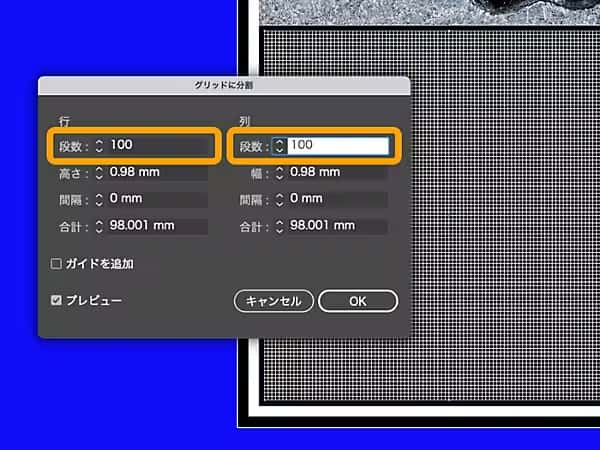 「オブジェクト>パス>グリッドに分割」を選択します。「⾏」と「列」の段数をそれぞれ「100」に指定します。これで綺麗なマス⽬ができました。