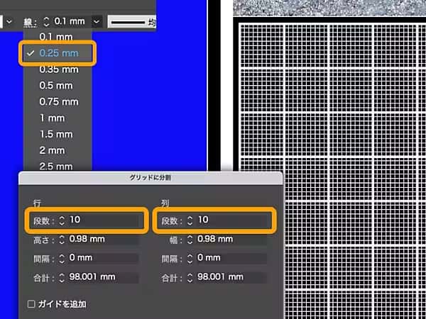 コピーした正方形を選択し、同じ⼿順で段数を「10」に指定したマス目をもう1つ作ります。さらに線幅を「0.1mm」から「0.25mm」に変更します。これで、10 マスごとに線が太い⽅眼紙のようなオブジェクトが完成しました。