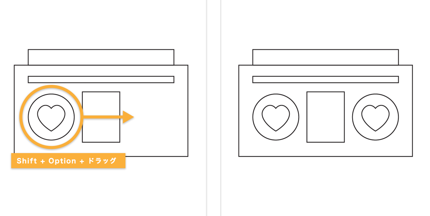 選択ツールで、ハート型のパスの端をクリックして選択します。Shiftキーを押しながらバウンディングボックスの角のハンドルをドラッグしてサイズを変更してから、丸いスピーカーの内側にハートをドラッグして移動します。Shiftキーを押しながら円をクリックし、両方のシェイプを選択します。Altキー(Windows)またはOptionキー(macOS)を押しながら両方のシェイプをドラッグして左側のスピーカーを右側に複製します。なお、Shiftキーを押すことで、両方のスピーカーの水平を維持したまま複製できます。