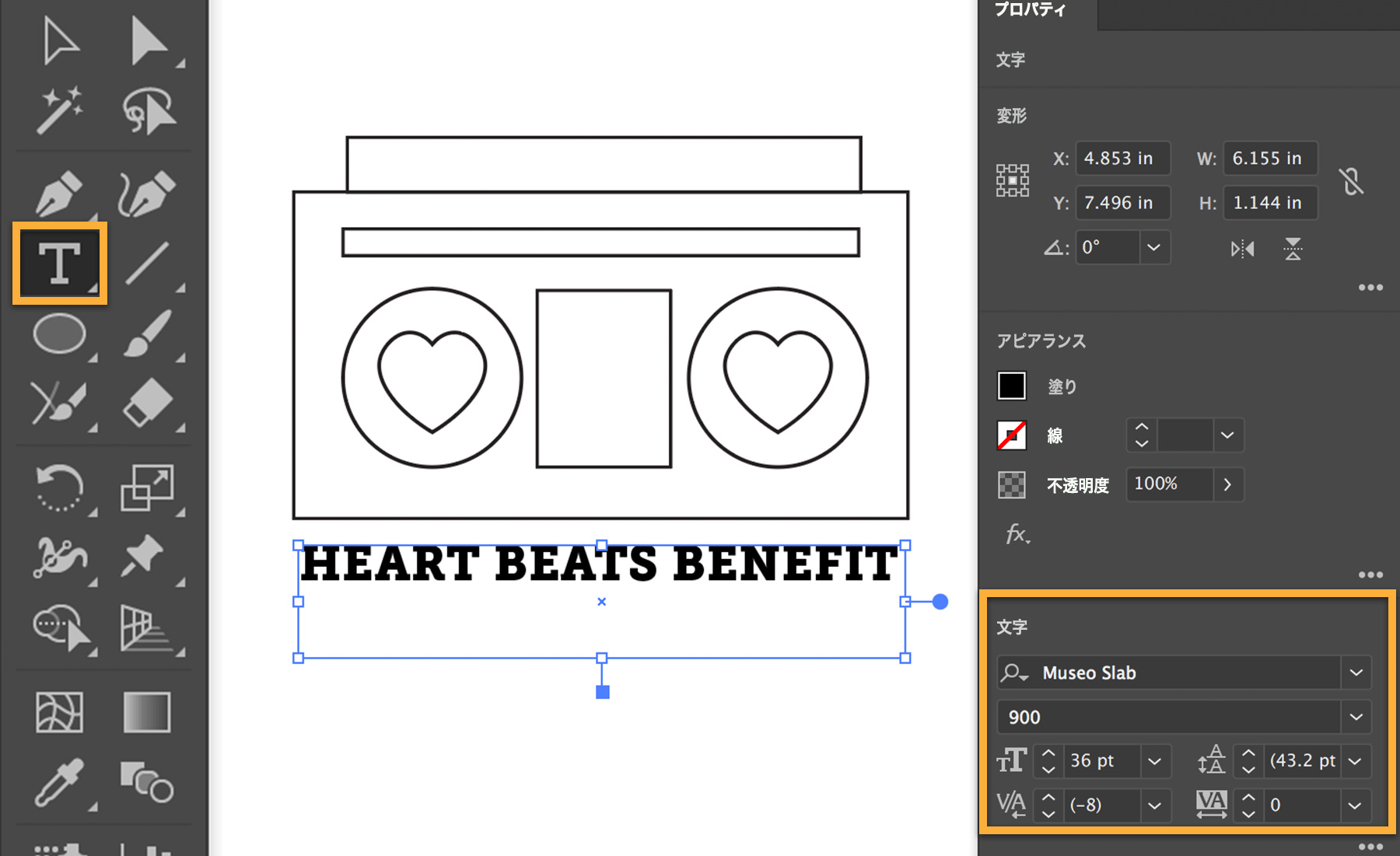 次に、ラジカセの下に太字の見出しを作成します。Tキーを押すか、ツールパネルで文字ツールを選択します。ラジカセの下にテキストフレームを作成します。デフォルトで入力されたテキストを、使用したいテキストに打ち換えてから、トリプルクリックしてテキストをハイライト(選択)します。プロパティパネルタブをクリックして、パネルを表示します(ウィンドウ/プロパティを選択します)。このパネルの「文字」セクションで、フォント、ウェイト、サイズの変更はもちろん、文字間隔の調整もおこなえます。人目を引く見出しを設定する方法については、美しいタイトルの設定 を参照してください。