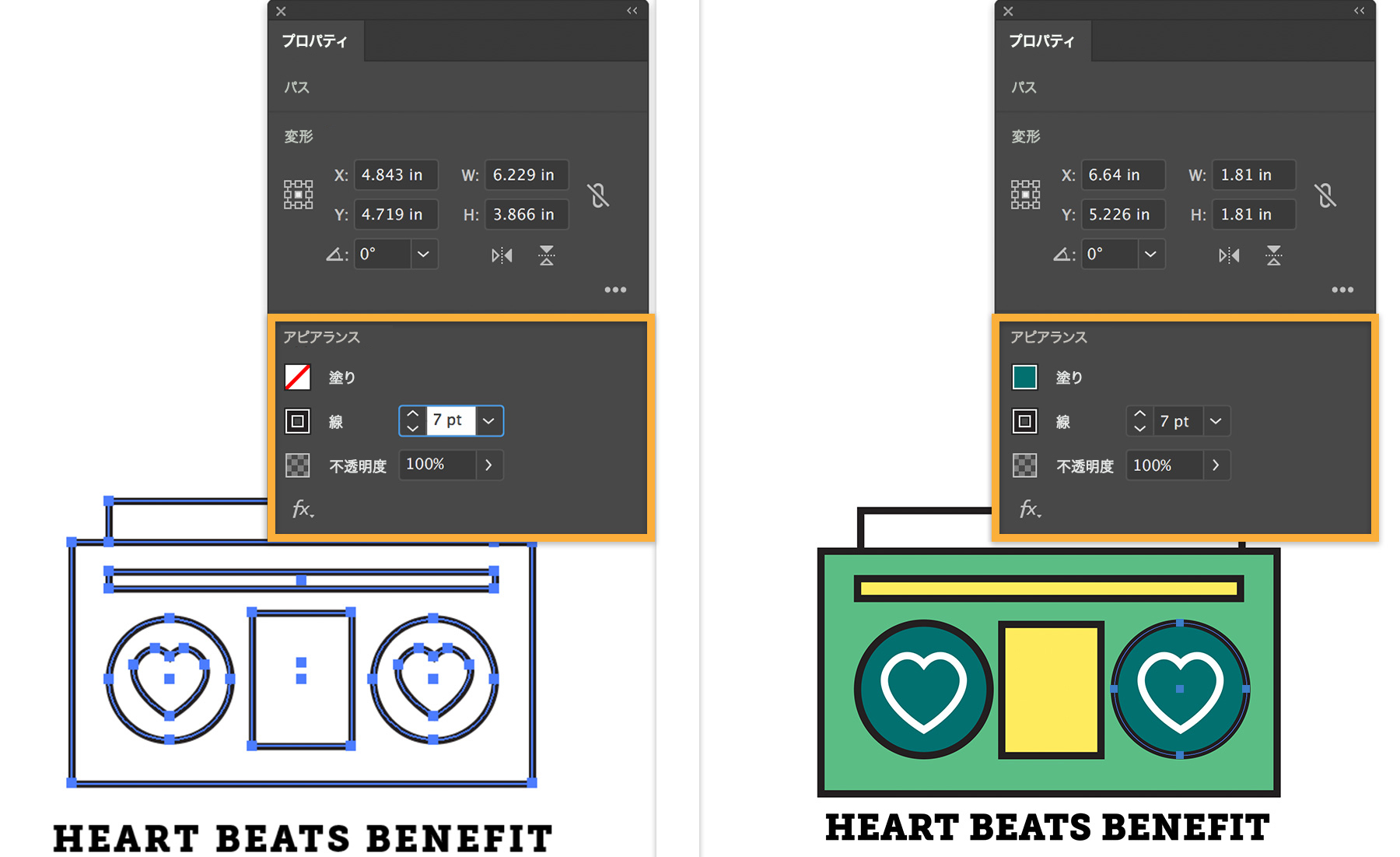 シェイプにカスタムカラーを適用するには、各シェイプを選択してから、プロパティパネルで「塗り」または「線」のアイコンをクリックします。スウォッチパネルが表示されるので新しいカラーを選択します。