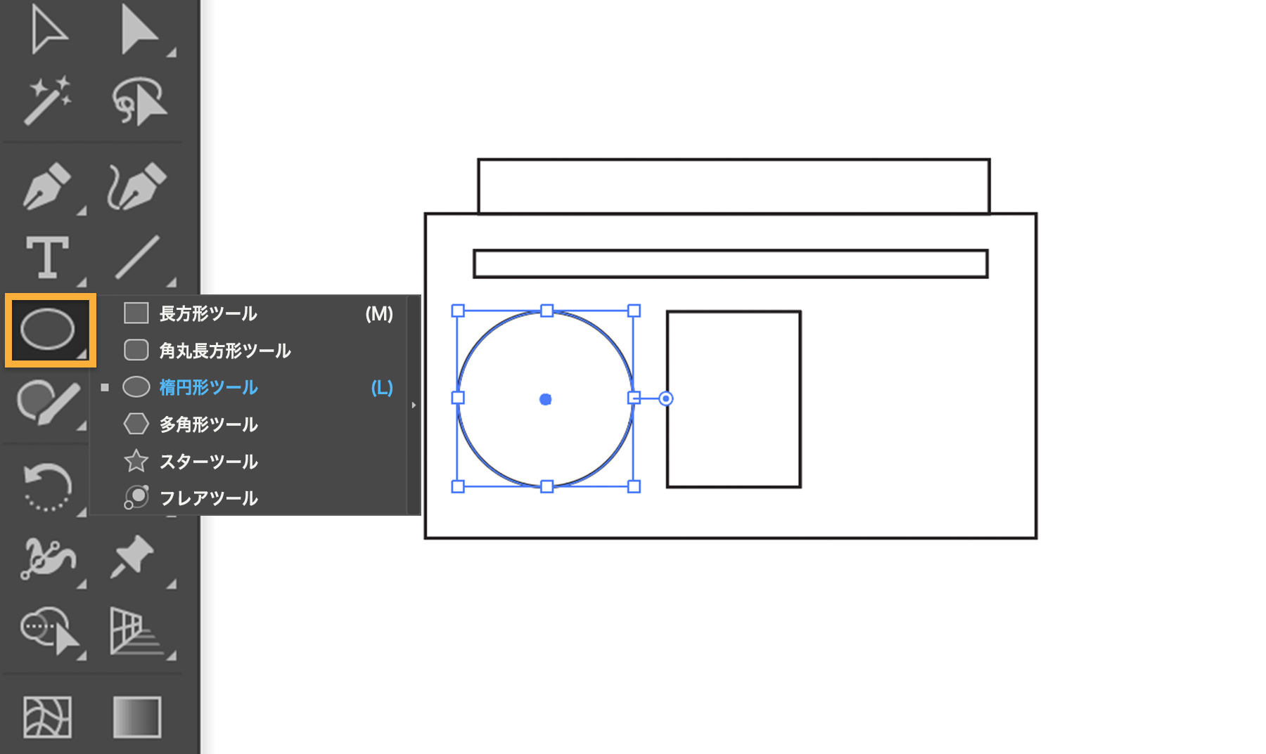 Mキーを押してツールパネルの長方形ツールを選択します。ドラッグして様々なサイズの長方形を描き、ラジカセのデザインを作成します。長方形のサイズは、いずれかのコーナーハンドルをドラッグすることで変更できます。アートボード上で長方形の位置を変更するには、長方形の中心に表示されたドット(点)をクリックし、動かしたい位置までドラッグします。
