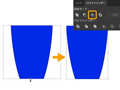 「ウィンドウ>パスファインダー」からパネルを表示し、「交差」をクリックすると、長方形と楕円が交差した部分がコップとして表示され、それ以外の部分は削除されます。