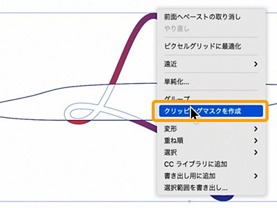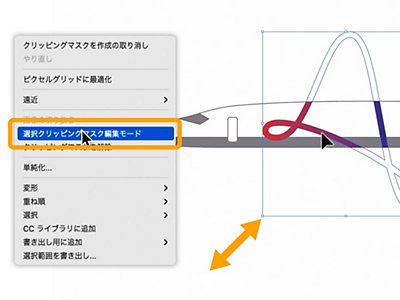 その状態でShiftキーを押しながらロゴを選択し、右クリックメニューから「クリッピングマスクを作成」を選択すると、機体の形でロゴをマスクすることができます。