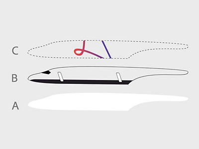 一番下にある機体(A)を選択し、塗りを「なし」にします。続けて、一番上の機体(C)を選択し、右クリックメニューから「重ね順>最背⾯へ」を選択します。