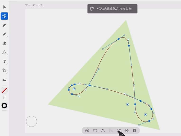 「ダイレクト選択ツール」でオブジェクト全体を選択すると、下にコンテキストウィジェットが表示されます。右から3つ目の「パスの単純化」ボタンをタップすると、不要なアンカーポイントが自動的に削除されます。