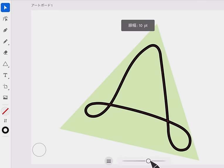 選択ツールでオブジェクトを選択し、下に表示されたコンテキストウィジェットの左から2番目の「線幅」ボタンをタップします。スライダーを右に動かして線幅を太くします。