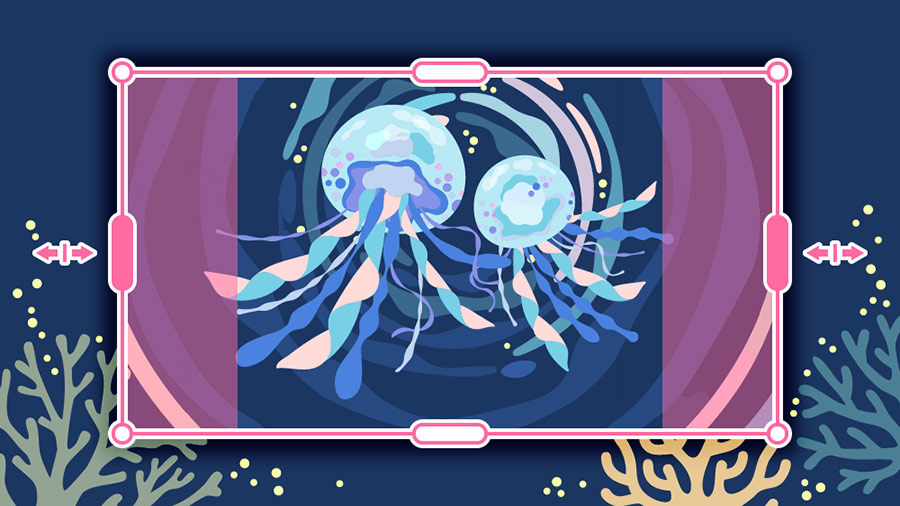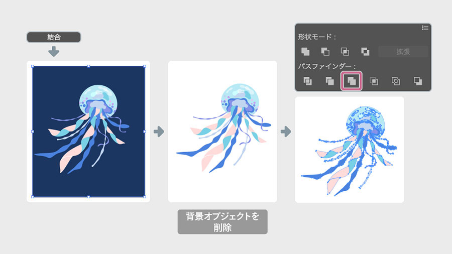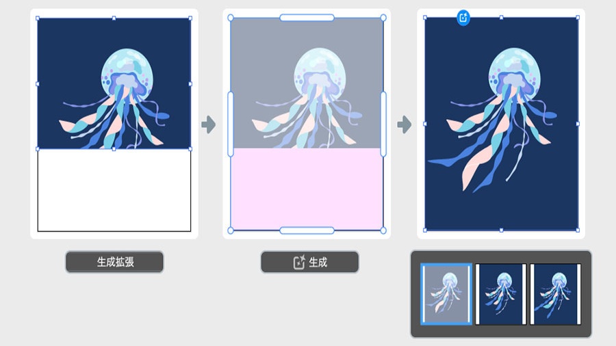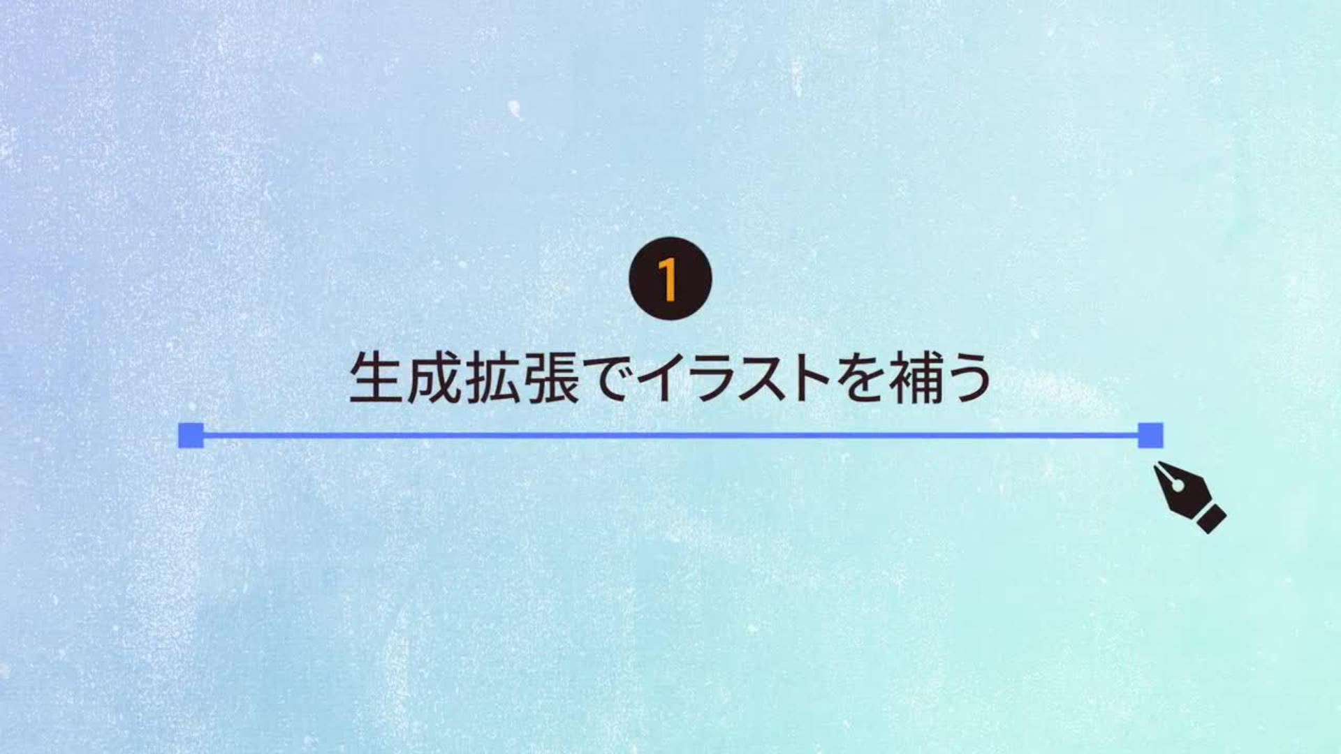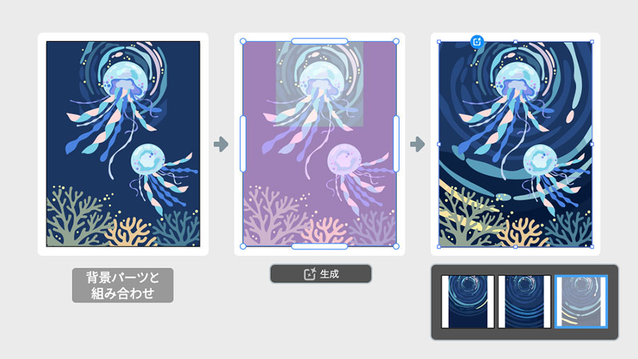 海中を泳ぐクラゲのイラストを例に、生成拡張で画角外の要素をベクター生成します。adobe illustratorのAIが周辺のアートワークを解析し、自然な質感でベクターイラストが生成されたかのように拡張されます。必要に応じて背景パーツにも生成AIを適用し、全体のデザインテイストを統一します。