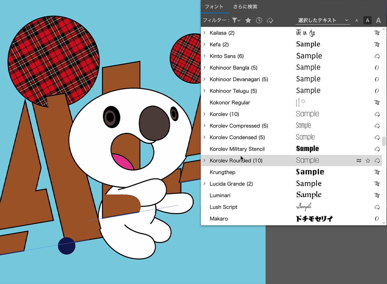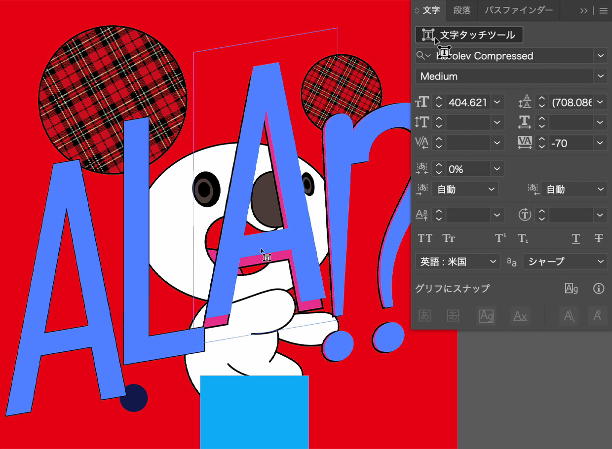 文字パネルの「文字タッチツール」(shift+T)をクリックすると、テキストのパーツを分解せずに位置やサイズ、角度などを調整することができます。