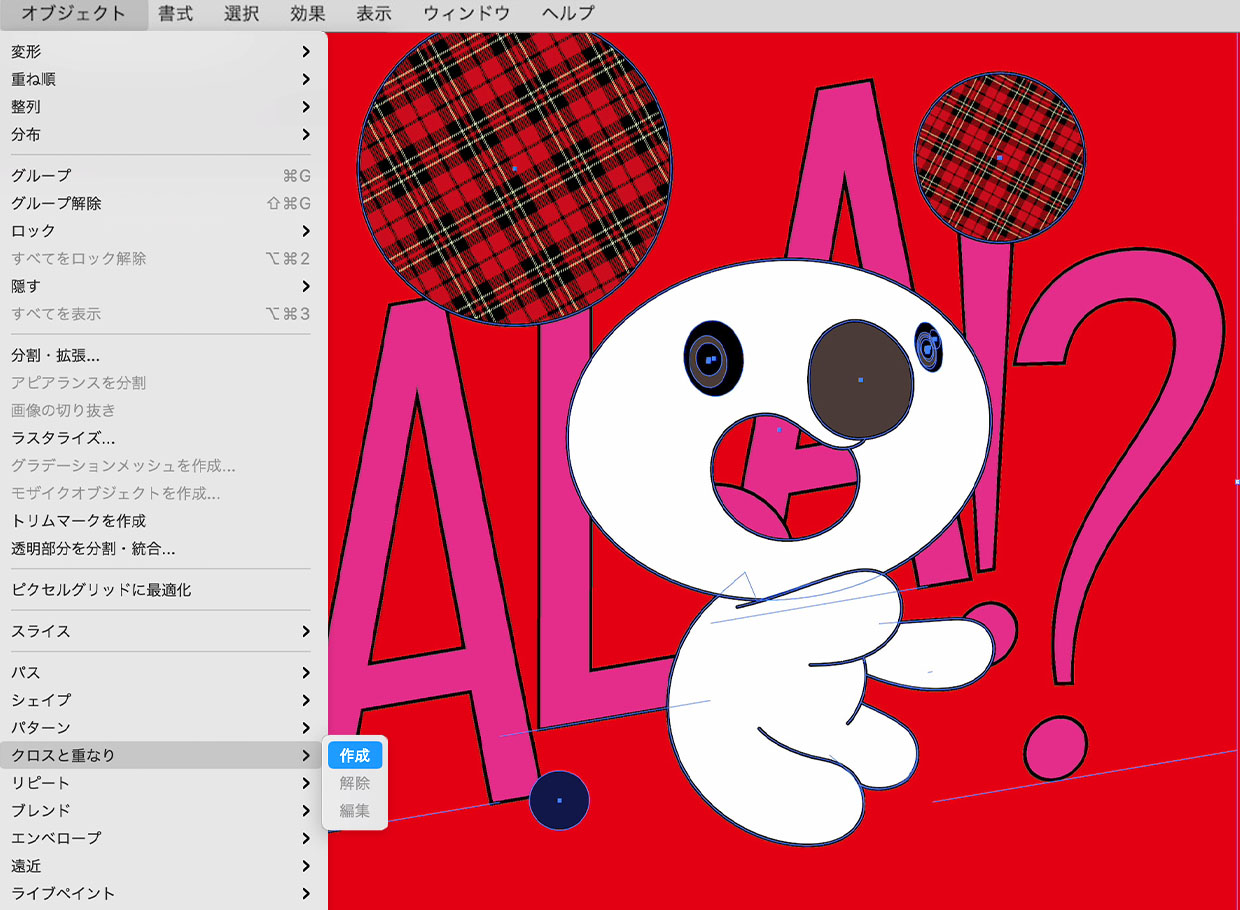 文字のレイヤーをキャラクター背面に移動した上で、重ね合わせたいオブジェクトを同時に選択し、オブジェクト>「クロスと重なり」>「作成」をクリック。