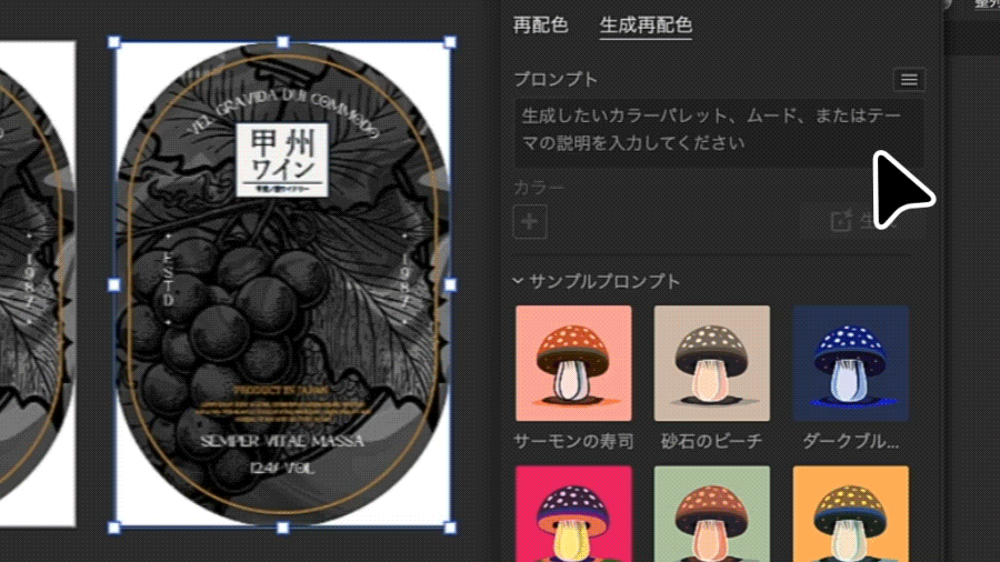 Illustratorの「⽣成再配⾊」を使⽤すると、⾃分がイメージする⾊の説明をテキストで⼊⼒するだけで、ベクターアートワークの配⾊を瞬時に変更することができます。ここでは、⽣成AIのパワーを活⽤して、ワインラベルのカラーバリエーションをすばやく作成する⽅法をご紹介します。まずは下の動画で⼀連の制作⼯程を確認しましょう。