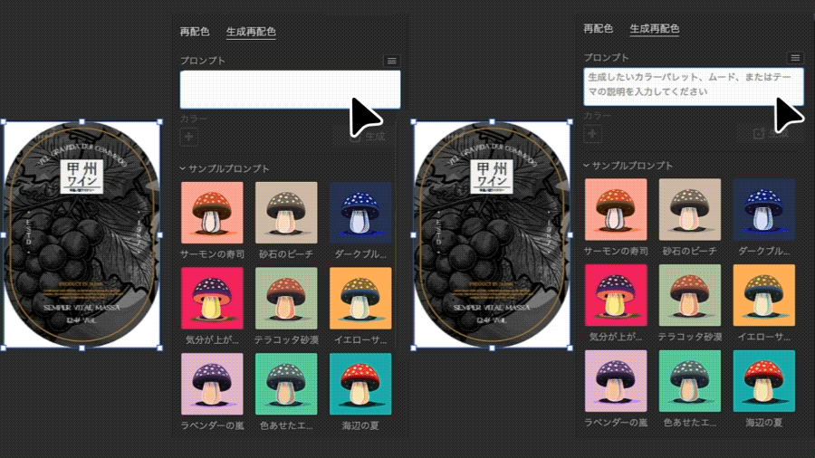 同様に、他のアートボートのアートワークの配⾊も変更していきます。プロンプトにそれぞれ「⽩ぶどうの爽やかなワイン」、「爽快に弾けるスパークリングワイン」と⼊⼒して配⾊を⽣成します。