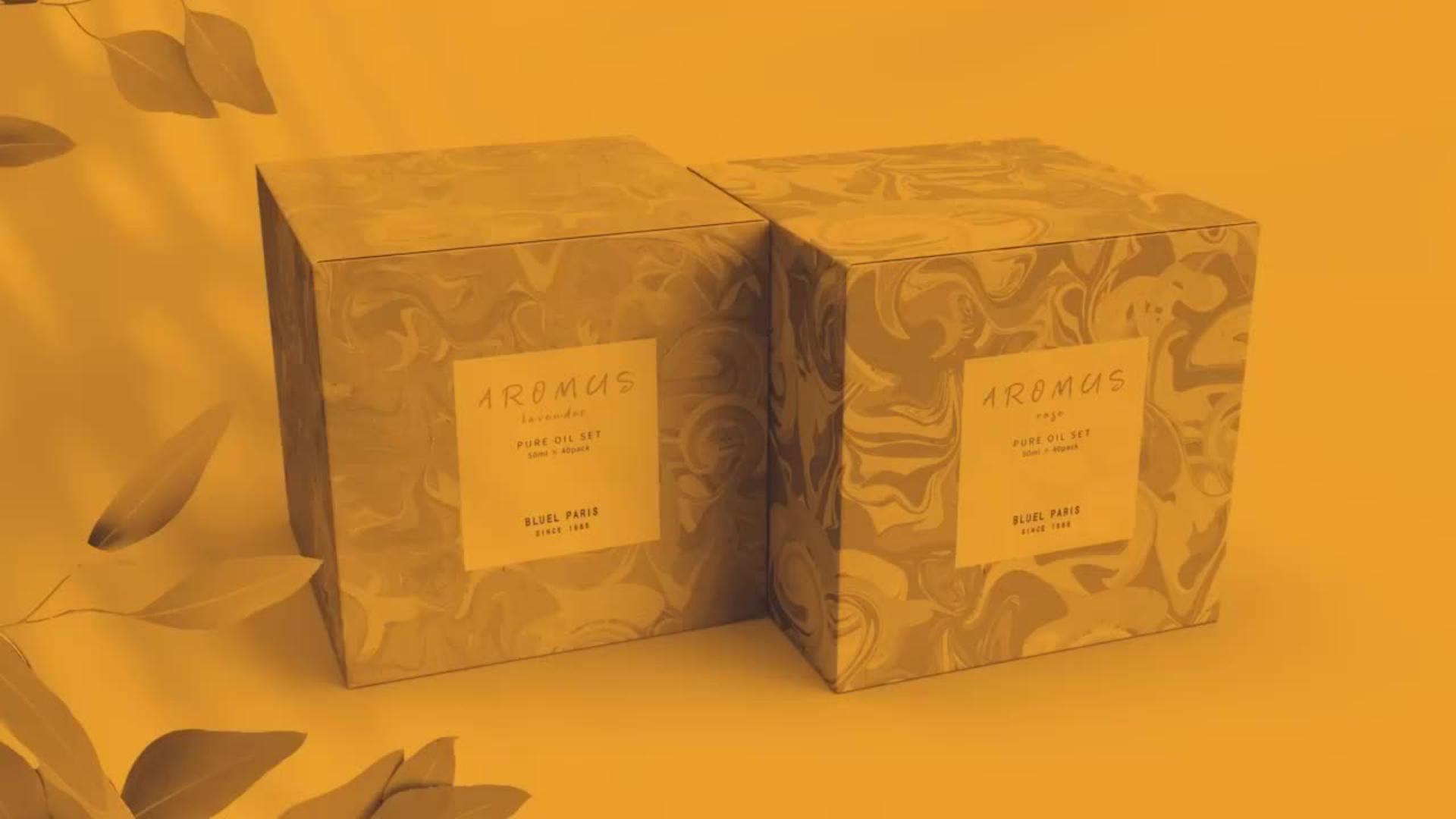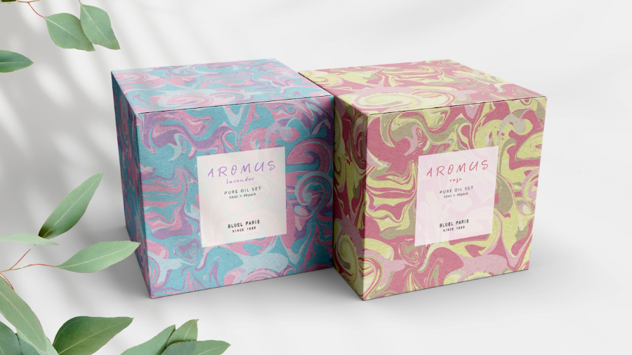 完成したマーブル模様は下のように商品パッケージのデザインに使ってみたり、好きな形や⼤きさに切り取ってチラシやバナー、ステッカーなどの背景に使ってみたりと、さまざまな⽤途に活⽤することができます。