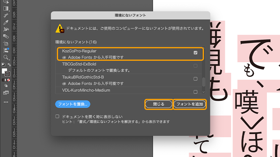 「環境に無いフォント」ダイアログが表⽰されたら、「⼩塚ゴシック」フォントのみにチェックを⼊れて、「フォントを追加」をクリックします。
