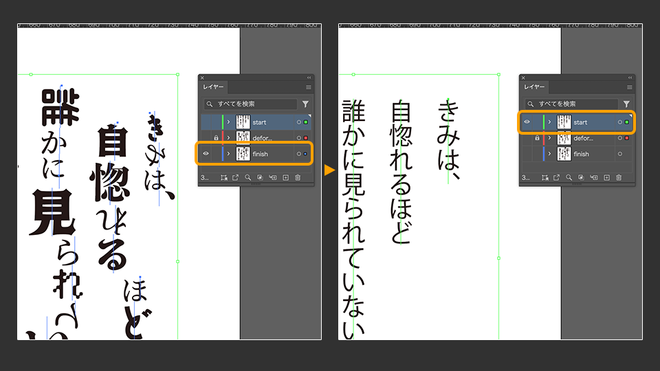 他の⽂字も変形してみましょう。レイヤーパネルを表⽰し、「deformation」レイヤーが変形の完成サンプルとなるので参考にしてみてください。