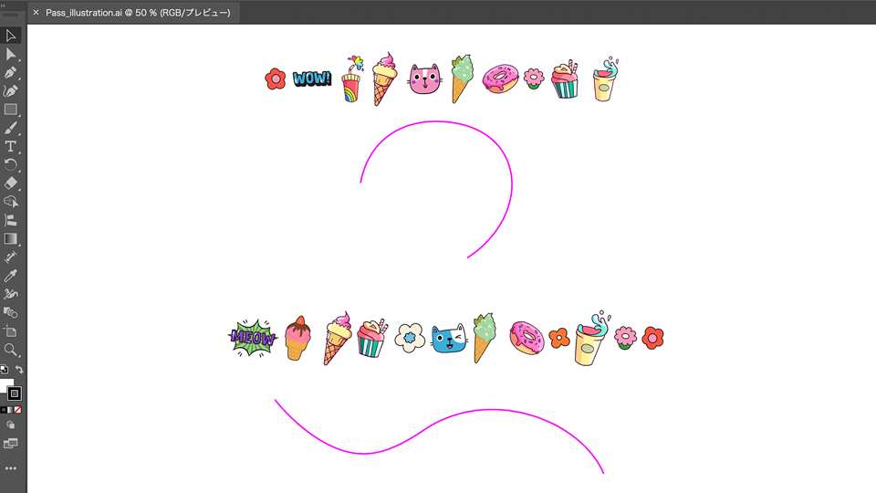 ①と同じ手順で、12点のイラストをすぐ下のパス上に配置します。