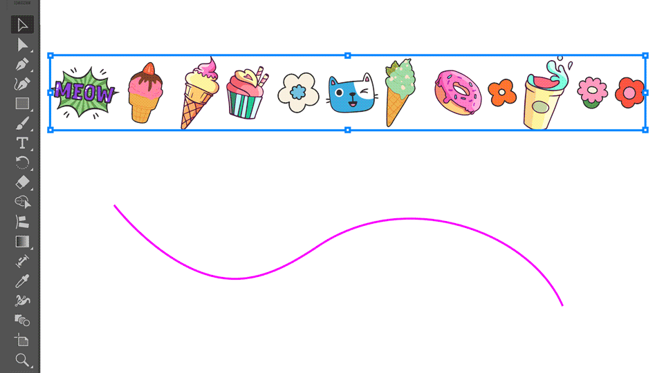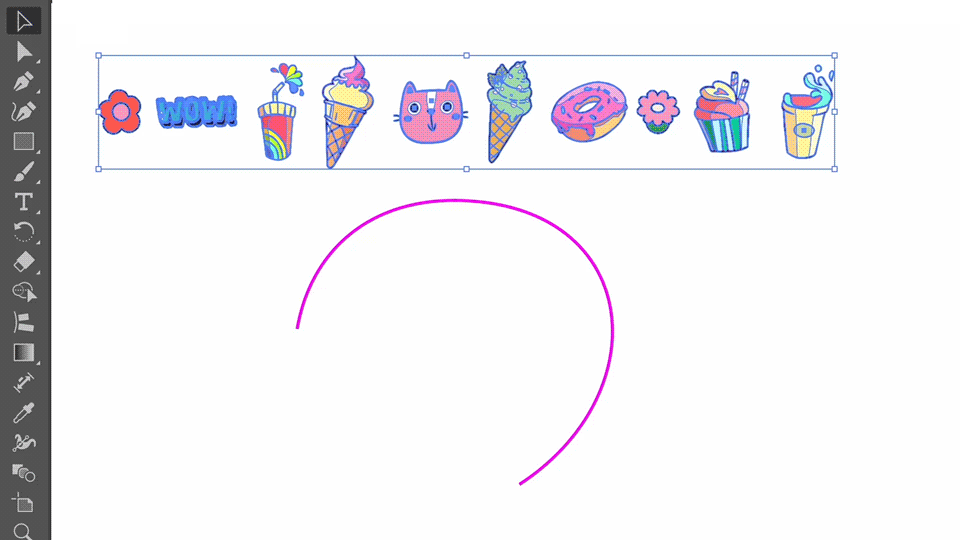 選択ツールでイラスト10点をまとめて選択し、ツールパネルから「パス上オブジェクト」ツールを選択して、下のパスをクリックします。10点のイラストがパス上に等間隔で配置されます。
