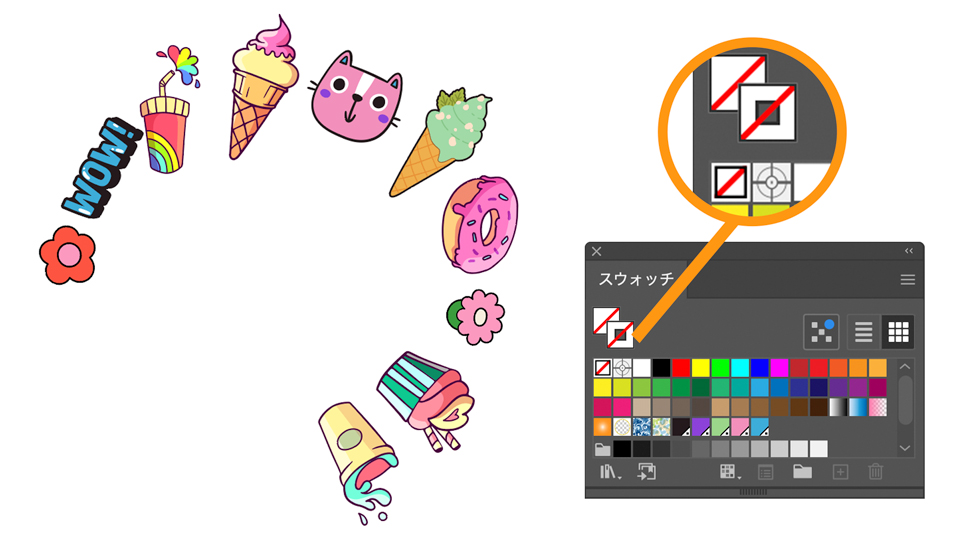 選択ツールでパスを選択し、スウォッチパネル(ウィンドウ>スウォッチ)を開きます。「線」を選択して「なし」をクリックし、線を消します。