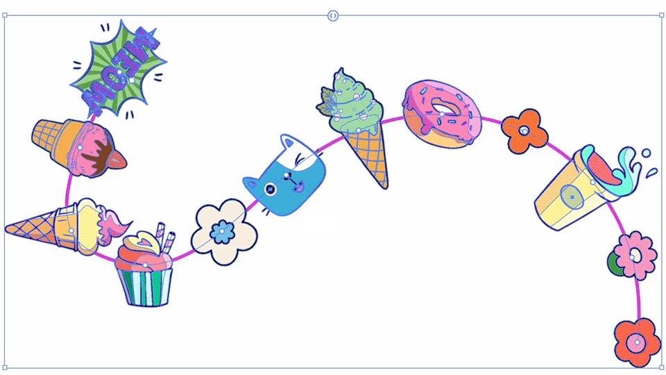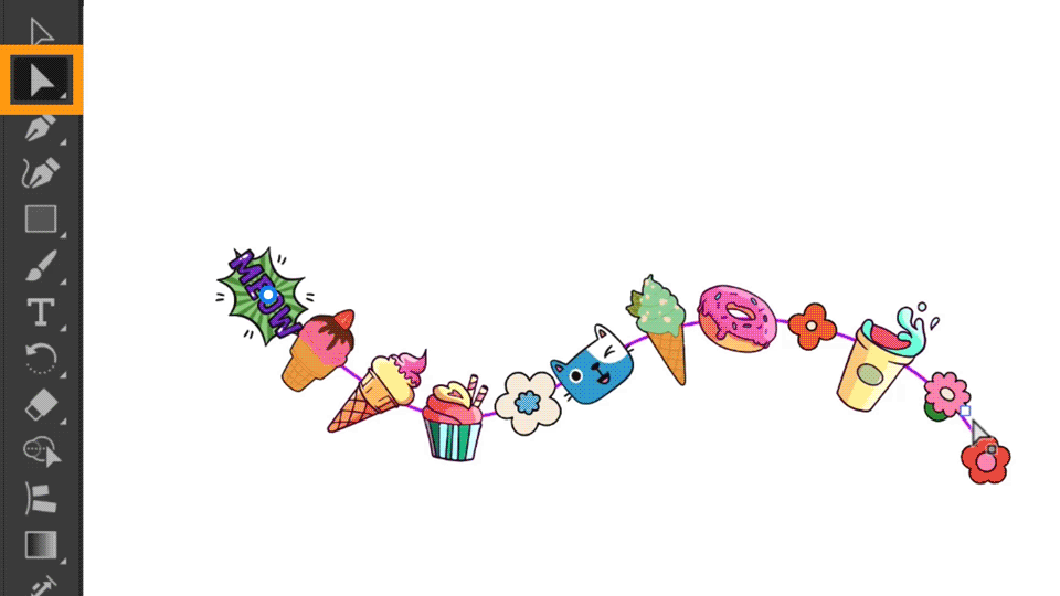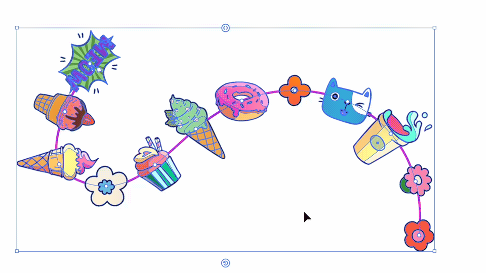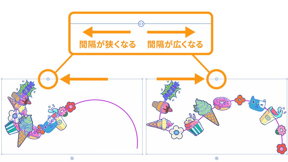 バウンディングボックスが表示された状態で、個々のイラストの中心にある白い丸をつかみ、移動したい場所までドラッグします。個々のイラストはパス上のどこにでも移動が可能。移動後はイラストの間隔と角度が自動的に調整されます。