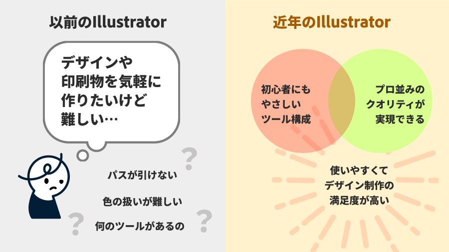 以前は「パスが引けない」「色の扱いが難しい」「どのツールを使えばいいかわからない」といった悩みを抱えがちだったIllustratorも、近年の機能向上により大きく変化しました。初心者にもやさしいツール構成とプロ並みのクオリティが実現できる機能の両立により、使いやすさとデザイン制作の満足度が飛躍的に向上しました。