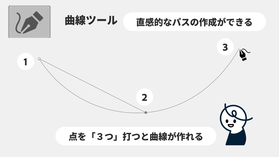 以前のペンツールが苦手だった方におすすめしたいのが、曲線ツールです。曲線ツールを使用すると、パスの作成と描画を簡単に実行できます。以前のように複数のツールを使い分ける必要がありません。一つのツールでポイントの作成·編集·調整がすべて可能なため、ツール切り替えの手間を省けます。ハンドルの操作を意識する必要もないため、直感的にパスが作れます。